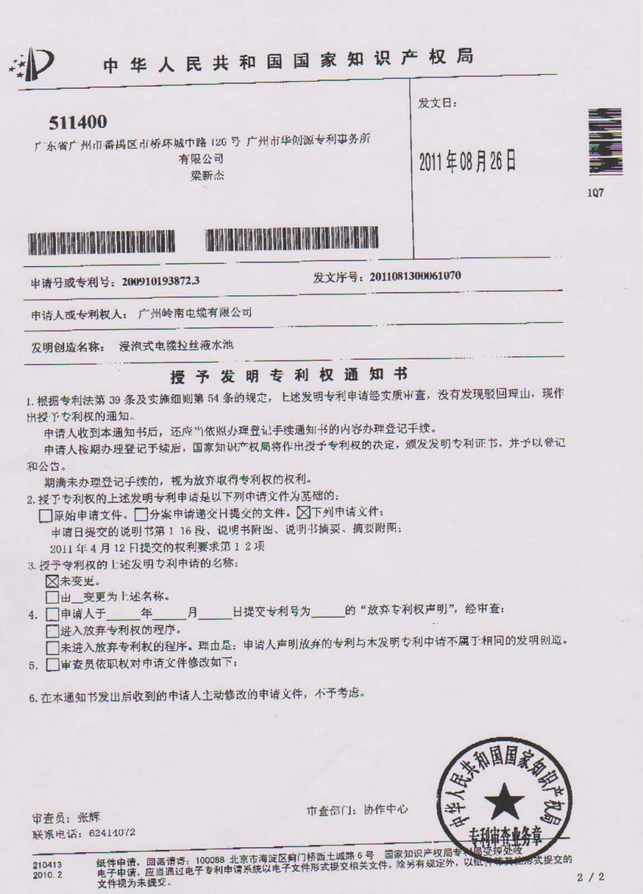 公司于2011年8月获得国家知识产权局授予的发明专利权通知书,发明创造名称为“浸泡式电缆拉丝液水池”,发文序号为:201108130061070,专利号为200910193872.3。