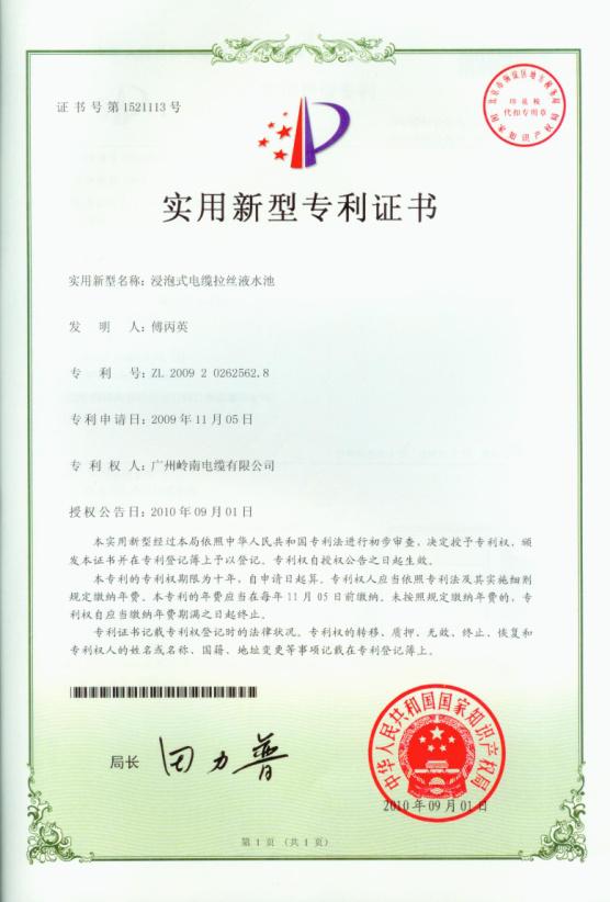 公司一直以来不但注重对创新产品的开发,更重视对生产设备的改良与创新。为适应现代低碳、环保、节能等新型生产理念,公司对生产设备不断改良,且取得了优良成果。继2009年太阳能烘房的建成并取得实用新型专利后,今年公司通过生产、工程、技术和品管四大部门人员合力研发,将大拉机乳化液池和冷却水池进行改进,将乳化液池和冷却水池改为不锈钢箱体,并浸泡在一个大的水池中,不锈钢箱体与冷却水热交换和热交换器与冷却水热交换同时进行,不但提高了热交换的效率,减少了拉丝乳化液和拉丝退火冷却水的用量,还减少了热交换用冷却后岁的浪费,可谓一举多得。公司同时对该新的拉丝液水池申请了专利,经过国家专利局的认真任何,认为我公司的浸泡式电缆拉丝液水池确实结构新颖,属于全国首创,授予我公司实用新型专利(专利号:ZL200920262562.8)。
