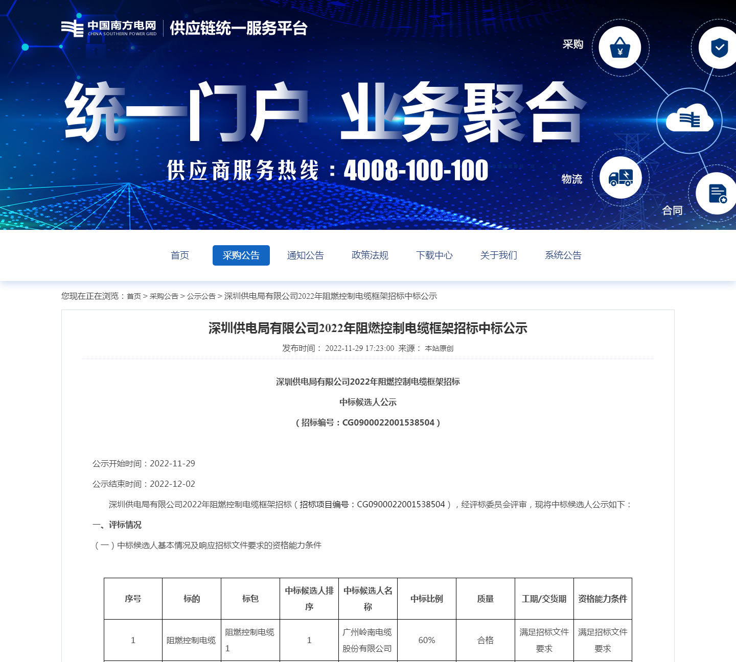 2022年12月,正值bbin体育一线生产热火朝天之际,从电网公司传来捷报:bbin体育凭借领先的研发技术、雄厚的实力规模、卓越的产品品质和完善的服务体系,分别中标“国家电网有限公司2022年第七十二批采购(输变电项目第六次变电设备(含电缆)招标采购)项目”、“国网湖南省电力有限公司2022 年第二次配网物资协议库存招标采购项目”和“深圳供电局有限公司2022年阻燃控制电缆框架招标项目”。